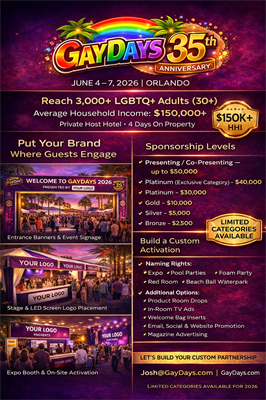 Join thousands from across the country for GayDays 2026, a four-day LGBTQ+ celebration featuring pool parties, nightlife, entertainment, and community connection—all hosted at a fully private, host hotel experience in Orlando.